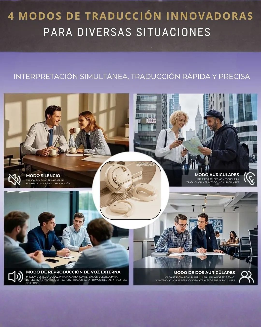 Con los Auriculares Traductores, descubrirás una nueva forma de comunicarte en cualquier idioma. Equipados con un avanzado sistema de inteligencia artificial, traducen en tiempo real más de 140 idiomas, brindando conversaciones naturales y precisas en tus viajes, reuniones o clases.