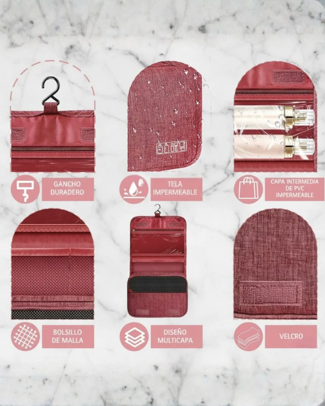 Gran capacidad con múltiples compartimentos: bolsillos de malla y PVC transparente que permiten ver todo de un vistazo, ideales para botellas, maquillaje, cepillos, cremas y más.