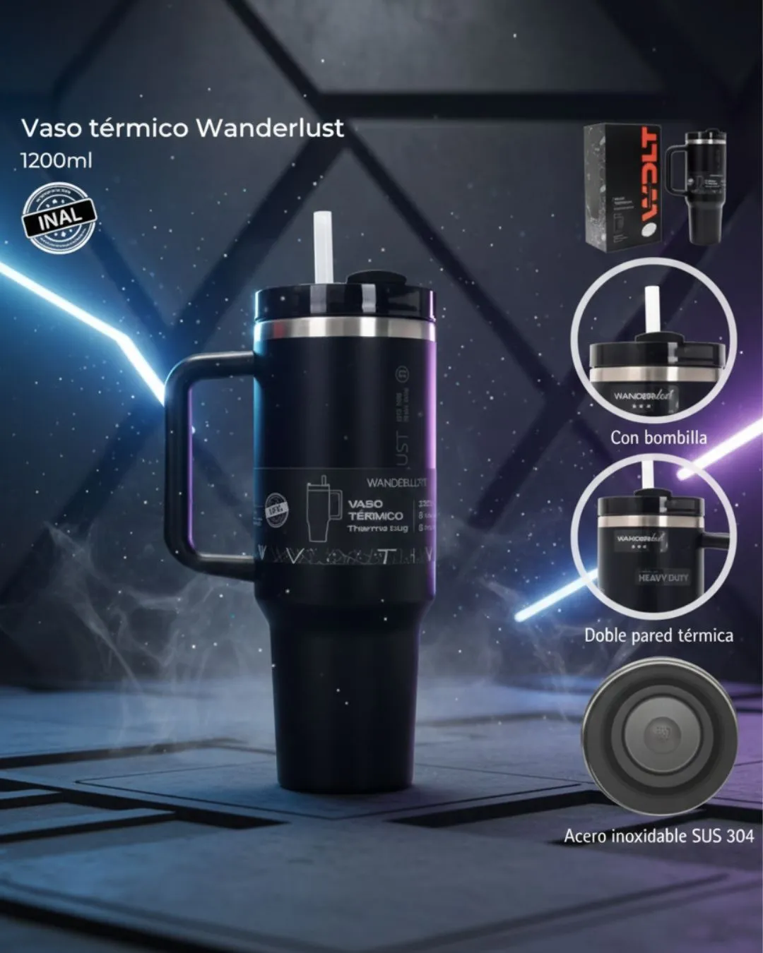Fabricado en acero inoxidable de alta calidad, este vaso mantiene tus bebidas frías o calientes por horas. Su capacidad de 1.2L es ideal para quienes necesitan hidratación constante sin recargar.