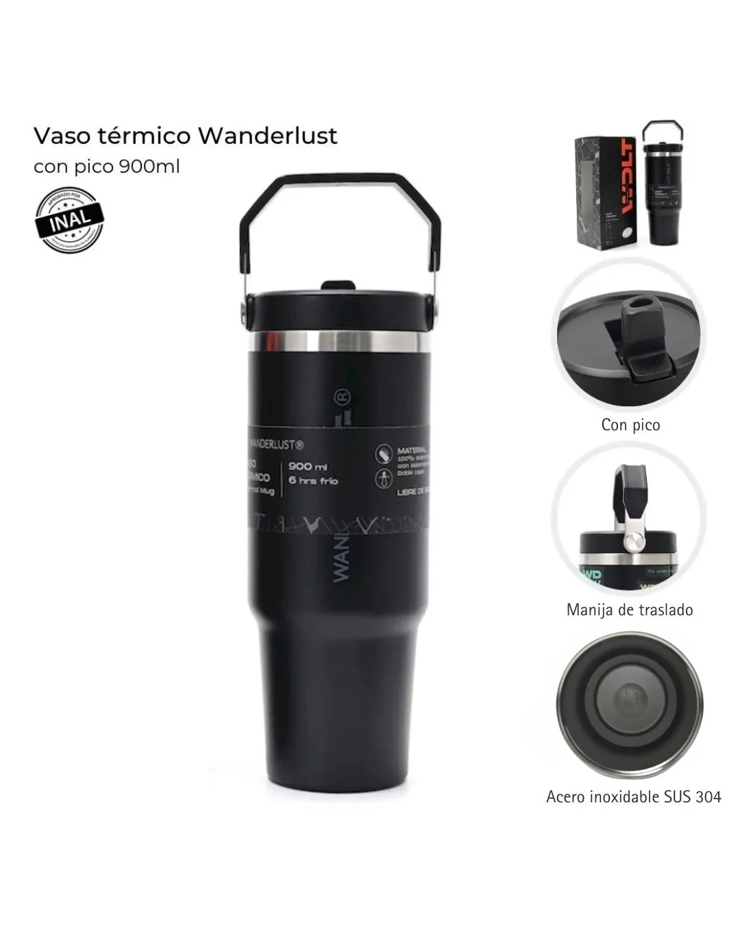 El Vaso Térmico Wanderlust 900 mL está diseñado para acompañarte en la aventura, en la rutina y en cada momento en el que quieras disfrutar tu bebida favorita a la temperatura ideal. Fabricado en acero inoxidable de doble capa y con aprobación INAL, mantiene tus bebidas frías o calientes hasta 6 horas, ofreciendo una experiencia práctica, cómoda y segura estés donde estés.